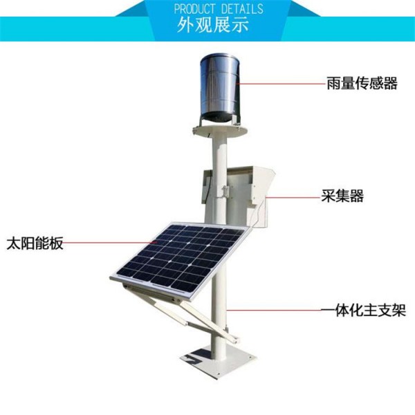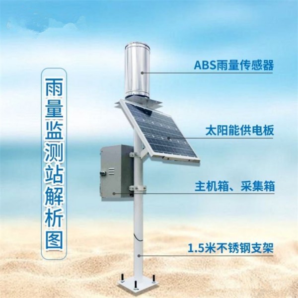 雨量监测站带太阳能供电 系统构成自动雨量站由数据采集仪、翻斗雨量传感器、上位机软件、通讯单元及供电系统等部分构成。数据采集仪用于采集及记录雨量信息,内置大容量FLASH存储芯片可自动存储至少一年的气象数据,仪器配备有多种通讯接口用于与计算机建立有线(RS232、RS485、USB、RJ45)或无线(GPRS)通讯连接;雨量传感器是严格按照SL61-2003水文自动测报系统规范、GB11831-89水文测报装置遥测雨量计、GB11832-89翻斗式雨量计国家标准要求组织生产、装配、检定。可用于以防洪、供水调度、电站水库水情管理等为目的水文自动测报系统、自动野外测报站;功能强大的上位机软件可远程观测实时水雨情信息,具有数据库、报表、打印等功能,用户还可利用该功能完善的气象软件对记录的数据作进一步的处理分析。