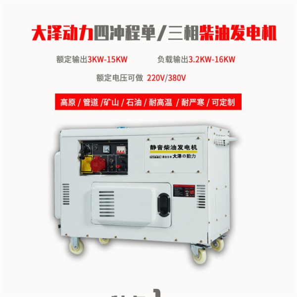 大泽动力直销小型发电机,小型家用发电机,数码变频发电机,手提式发电机,便携式发电机,全自动发电机,1KW发电机,2KW发电机,3KW发电机,5KW发电机,6KW发电机,7.5KW发电机,10KW发电机,20KW发电机多燃料发电机及各类动力设备如:马路切割机,发电焊机,发电焊机,自吸泵,大型发电机组,大泽动力电机优点:功率大,耗油低,节油控油,价格合理,质量过关,拥有各项证书,可检验, 技术研究生产,长期与中铁工程公司,山东海洋工程,江苏江都建设国外工程施工公司,移动营业厅,气象局,及所有家庭用户,企业用户,个人用户等合作,客户评论口碑好。相信大泽,相信我们的品质,更相信我们的服务。