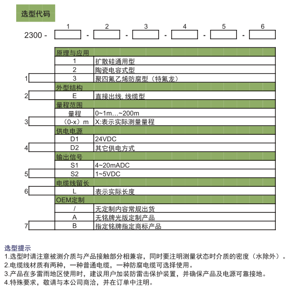 2300型液位传感器是将硅压阻式隔膜充油芯体作为信号测量元件密封于不锈钢壳体内构成,专用于电缆与外壳密封连接,电缆内有导气管,使传感器被压腔与大气想通,确保了测量的精度,可长期投入与变送器结构材料相兼容的液体中使用。