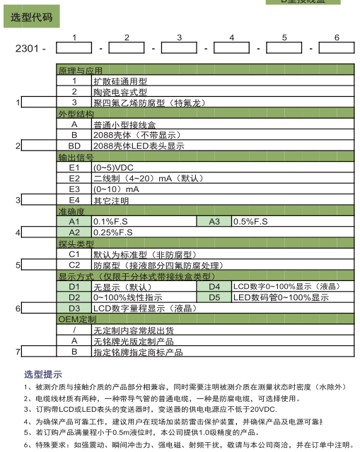IP68(压力传感器部分),IP65(接线盒变送器部分); |