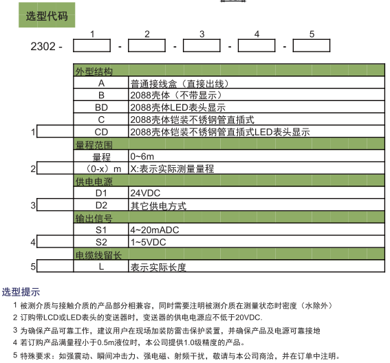 2302型液位变送器采用进口硅压阻式充隔离膜充油芯体作为信号测量元件,根据被测液体的压强、密度、液位三者的数学模型关系,通过也传感器把与液位深度成正比的液位压力测量出来,并经过信号处理电路转化成标准信号输出,专用导气电缆、先进的工艺密封技术和可靠的专用放大电路及精密的温度补偿技术,使得产品具有精度高、体积小,防渗漏性能好的特点。长期浸入液体中工作可靠、稳定。