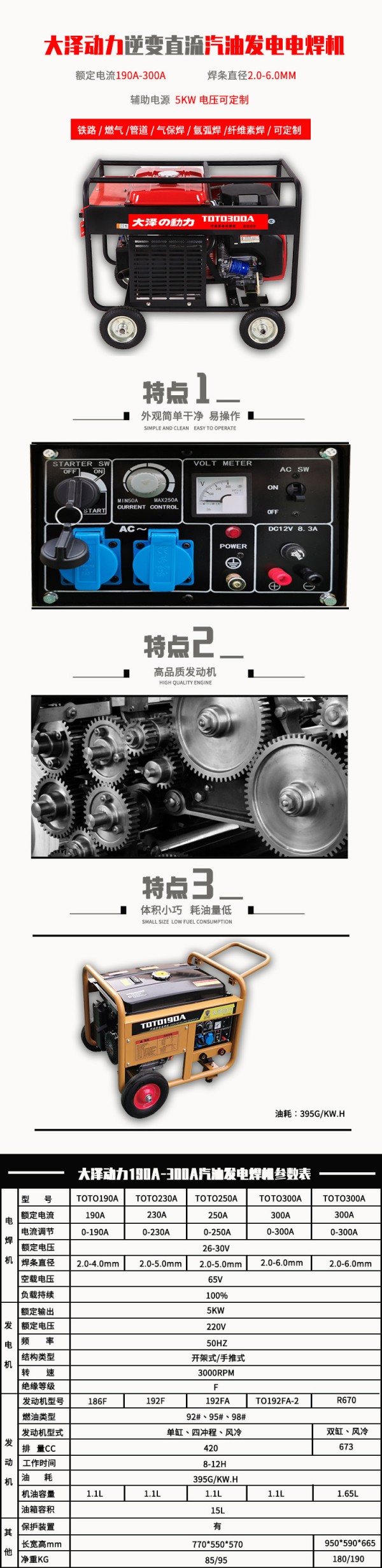 小型230A汽油发电电焊机 动力焊接机开发的技术的免维护使用, 用无碳刷, 无励磁绕组, 无稳压装置,没有原电子装置的特点,结构非常简单