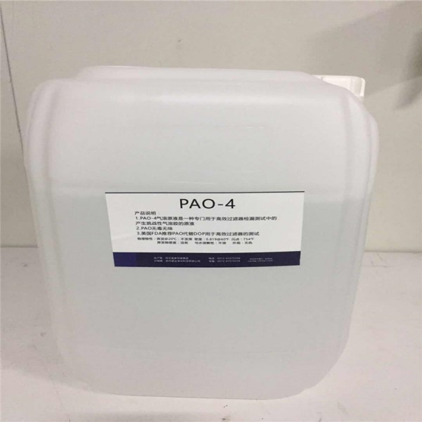 高效过滤器检漏PAO油PAO4气溶胶原液是一种专门用于高效过滤器检漏测试中的产生挑战性气溶胶的原液,CAS(美国化学物质产品登记号)为68649-12-7,化学成分为1-Decene, tetramer mixed with 1-decene,中文对应的名称氢化-1-癸烯四聚体与1-癸烯三聚体;又名聚阿尔法烯烃是poly-alfa-olefins.原液的浓度为100%.
