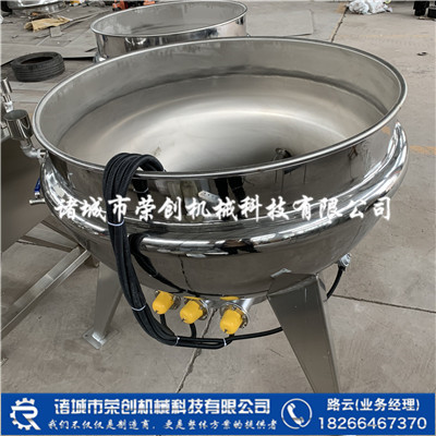 火锅底料熬汤炊事设备 可倾式夹层锅的外形为表里球形锅体,操控面板选用方方正正的不锈钢盒体,外型漂亮、装置简单、操作便利,荣创夹层锅配有MEACON压力表和上海良工安全阀,于细微处彰显荣创人对品质的追求.