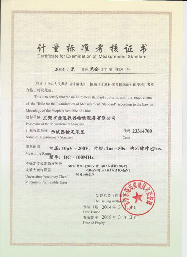 世通仪器校准计量检测中心包括广东,上海,重庆,河南,陕西,成都世通仪器检测服务有限公司和江苏世通仪器检测服务有限公司(昆山)!是通过中国合格评定国家认认可委员会认可(认可号L3170和L6634),是专业从事仪器校准,仪器计量,仪器校正,仪器校验,仪器校准的计量实验室。服务全国各个城市,可到厂服务。 本公司校准检测中心设有:力学、长度、衡器、电学、热工、无线电、几何量等专业校准实验室。本校准中心可对以上类别范围的各国仪器进行校准并出具校准证书。校准/检测报告具有权威性、可靠性、公正性。公司在上海、福建、浙江、天津、重庆、山东、江苏,西安,成都,河南等各省市设有全资分公司。公司拥有发明和实用新型30余个。在国内期刊发表论文多篇,并被授予为省,市高新技术企业,市培育企业。
