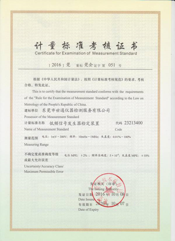 世通仪器校准计量检测中心包括广东,上海,重庆,河南,陕西,成都世通仪器检测服务有限公司和江苏世通仪器检测服务有限公司(昆山)!是通过中国合格评定国家认认可委员会认可(认可号L3170和L6634),是专业从事仪器校准,仪器计量,仪器校正,仪器校验,仪器校准的计量实验室。服务全国各个城市,可到厂服务。 本公司校准检测中心设有:力学、长度、衡器、电学、热工、无线电、几何量等专业校准实验室。本校准中心可对以上类别范围的各国仪器进行校准并出具校准证书。校准/检测报告具有权威性、可靠性、公正性。公司在上海、福建、浙江、天津、重庆、山东、江苏,西安,成都,河南等各省市设有全资分公司。公司拥有发明和实用新型30余个。在国内期刊发表论文多篇,并被授予为省,市高新技术企业,市培育企业。
