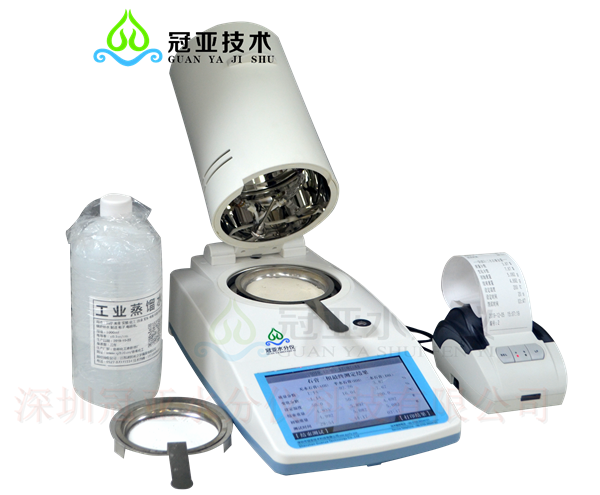 CS-001系列番茄酱水分仪实验报告/原理由深圳市冠亚技术科技有限公司冠亚技术产品,能够快速测定浆料、粉末、膏状,纤维,片材、颗粒等用来测量任何物料中各种形态样品的水分含量,仪器根据热解重量原理,在水分快速检测领域中不仅提供一种快速烘干结构的水分议,并取得一种新型水分仪加热处理系统设备证书。测试开始水分测定仪测定样品重量,然后样品由内置的卤素干燥装置和水分蒸发器快速加热,在干燥过程中,仪器连续测定样品重量并显示丢失的水分。显示部分采用了高分辨率的7寸液晶大屏幕,可直接通过全屏触控的模式在液晶屏上直接进行测试参数、条件设定等,实现了无需人员培训,人员看护、维护实验过程,高科技自动模式;看说明书或者产品操作流程即可全面掌握并操作,同时根据说明书上的提示,即可简单处理设备工作中出现的各类现象。