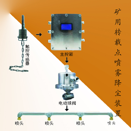 由主机、电动球阀、触控传感器、开停传感器、热释电传感器等组成。胶带机转载点全自动气水联动喷雾