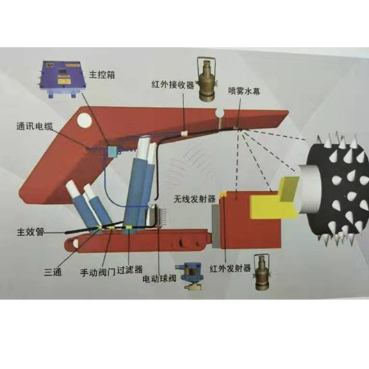 当割煤机移动时,通过割煤机上安装的遥控发送器扫描支架上安装的遥控接 收器产生信号。信号反馈到主机,主机自动控制电动球阀供水喷雾。矿用自动洒水降尘装置采煤机移架喷雾