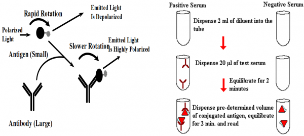 采样独特的荧光偏振检测原理,利用偏振光测量其旋转时间,检测血清中含有抗体,根据 FPA检测仪显示的mp读值判断结果阴阳性;荧光偏振测定法是均一、无需清洗步骤或去除未反应的成分的检测方法。