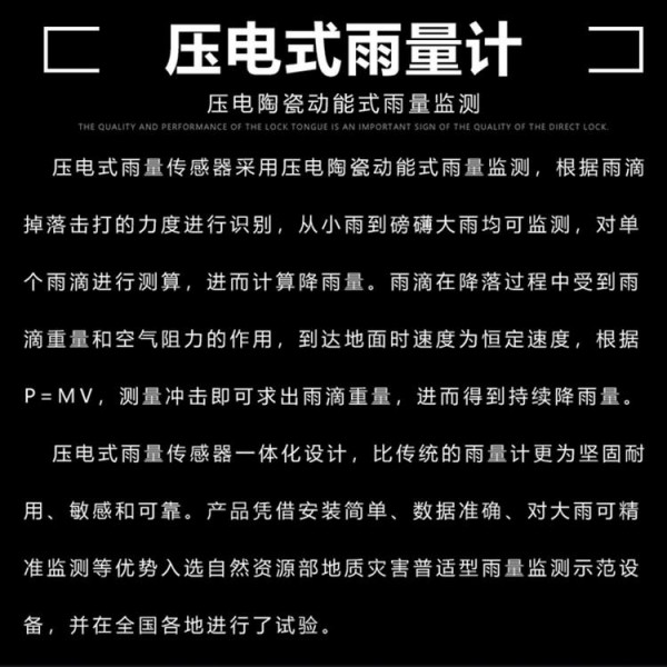 压电式雨量计无机械配件,比传统的雨量计更为坚固耐用、敏感和可靠。产品安装简单、数据准确、对大雨可精准监测。