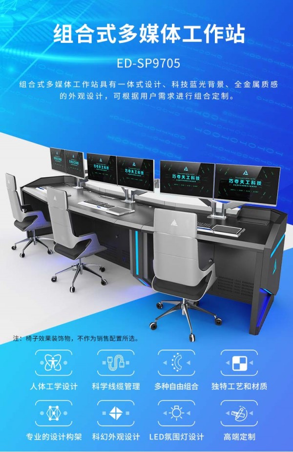 组合式多媒体工作站ED-SP9705运用全新的设计理念,采用科技风格的外观设计;组合式多媒体工作站具有一体式设计、科技蓝光背景、全金属质感的外观设计,可根据用户需求进行组合定制。组合式多媒体工作站也被行业称之为:控制台、操作台、调度台、监控台、操控台、工作台。产品特点:符合人体工程学原理,全金属制造(耐用、耐磨、防潮、防变形、抗震、易清洁),组装式钢铝结构,流线型设计,自带科技感元素,支持多屏展示,可单独使用亦可多台连接,外型美观、科幻、高档。