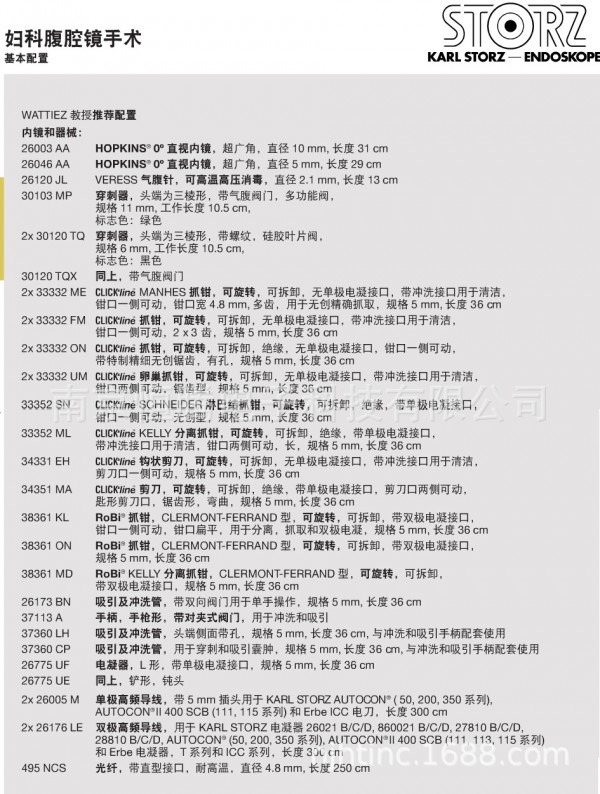 德国卡尔史托斯(KARL STORZ)腹腔镜和手术器械是迄今为止发展完善的腹腔镜手术设备,它集检查、治疗、手术、图像显示为一体,通过在腹壁上开3个约3毫米的微创口,将腹腔镜镜头插入腹腔内,运用数字摄像技术使腹腔镜镜头拍摄到的图像通过光导纤维传导至后级信号处理系统,并且实时显示在专用监视器上。然后医生通过监视器屏幕上所显示患者器官不同角度的图像,对病人的病情进行分析判断,并且运用特殊的腹腔镜器械进行手术。 腹腔镜手术迎合了人类所追求的“以0小的创伤来治疗外科疾病”的目标,是外科领域的一个重大发展。打破了手术必须剖腹开胸的传统观念,和其他普通手术相比,它具备了不可比拟的优点:
