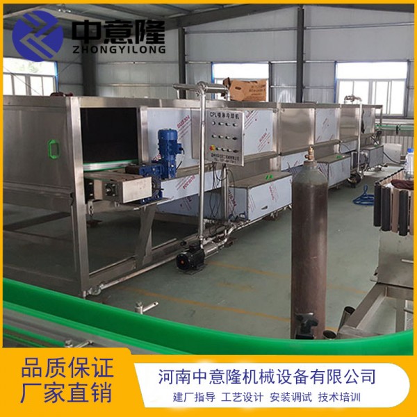 瓶子进入主机后通过传输星轮进入冲瓶机,瓶夹夹住瓶口沿冲瓶导轨向上翻转180°,使瓶口向下。在冲瓶机特定区域(由分水盘决定——冲瓶水由冲瓶水泵泵入分水盘,后由分水盘通过24根管路分配至冲瓶夹),冲瓶夹喷嘴喷出无菌水,对瓶子内壁进行冲洗。瓶子经冲洗、沥干后在瓶夹夹持下沿导轨向下再翻转180°,使瓶口向上。洗净后的瓶子通过过渡钢拨轮(纯水冲瓶)从冲瓶机导出并传送至下一工序-灌装。2021小型黑莓果汁生产线 河南果汁饮料设备厂家