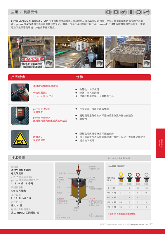 德国PERMA单点自动加油杯FUTURA SF05是一款理想的自动润滑系统,特别用於卫生环境恶劣、可能导致腐蚀金属润滑剂和电子系统的工作环境。其可靠的操作原理是利用电化学反应。运用四种顏色的啟动螺栓来选择润滑週期。根据您的需求,可以选择1、3、6或12个月的注油周期来注入容量120CM3的润滑剂。运用啟动螺栓產生的输出压力【