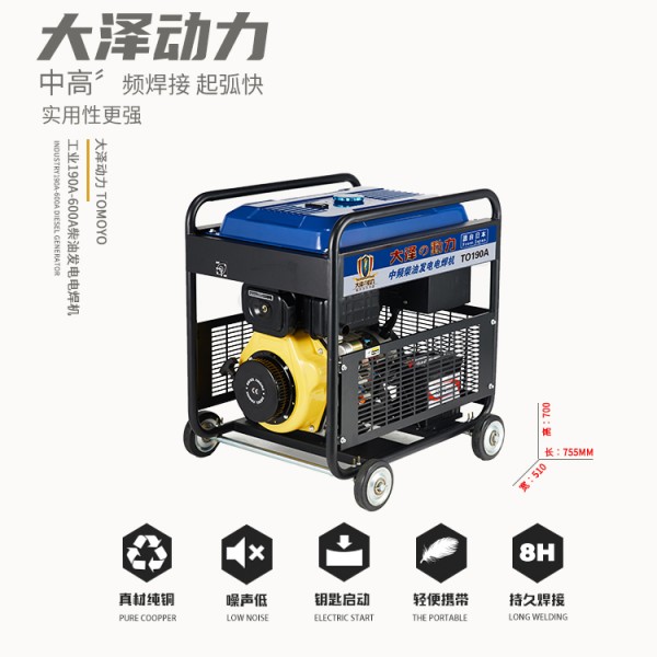 190A小型柴油发电电焊机两用 柴油发电电焊机本款机器启动快捷、运转平稳、穿透力强、焊接平滑(快)、震动小、油耗省、体积小、节省材料、结构紧凑、携带、移动方便点火稳定可靠等优点,手推移动式焊机,电启动模式大大提高您的工作效率,户外施工的理想伴侣!