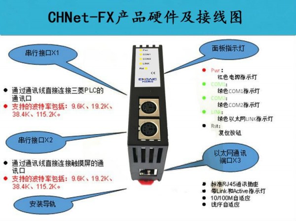 兴达易控CHNet-FX采用工业级设计,导轨安装,带通讯线。不占用PLC编程口,上位机通过以太网对PLC数据监控的同时,触摸屏可以通过复用接口X2与PLC进行通讯。CHNet-FX支持工控领域内绝大多数SCADA软件,支持三菱MC以太网协议和ModbusTCP两种通讯方式。