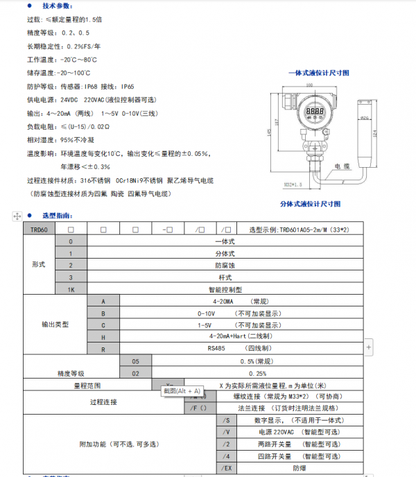 TRD600系列产品可分为一体式,分体式,防腐蚀型,杆式液位变送器及智能液位控制器等,是目前通用的液位测量仪表。产品通过高性能压力传感器,把与液位深度成正比的液位静压力准确测量出来并转换成标准信号输出,可直接与二次显示控制仪表、智能仪表或PLC等相连。安装方便,直接投入液体介质,即可测量出变送器顶端到液面的液位高度。其中,智能液位控制器可输出一路模拟量和四路开关量实现控制功能。目前该系列产品已广泛使用于石油、化工、电厂、城市供水、水文勘探领域的液位测量与控制中。天津智能液位变送器价格