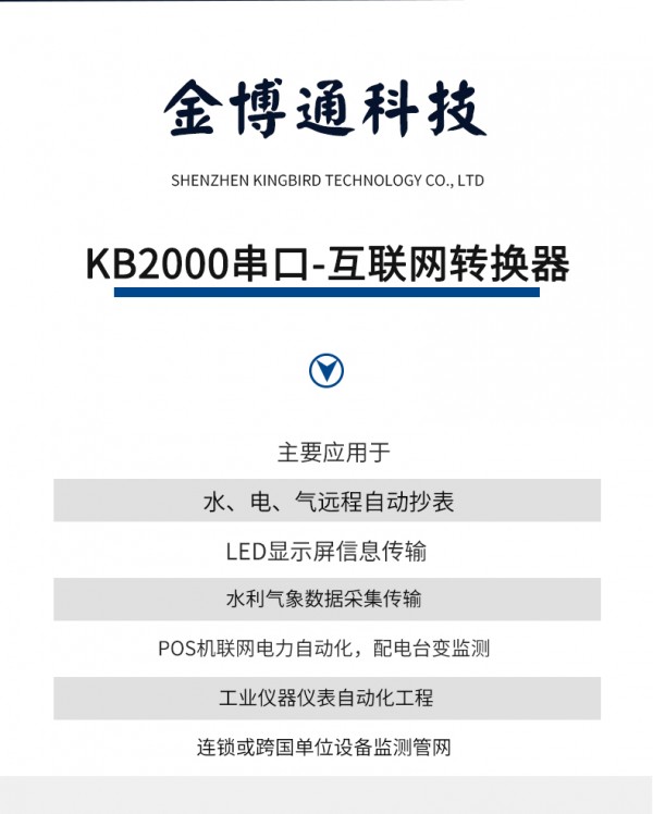 KB2000是RS232/485到TCP/IP 的数据协议转换器(专用于互联网数据通讯),它提供RS232/485到TCP/IP网络和TCP/IP网络到RS232/485的数据传输,它将从转换器的RS232/485串行口上收到的数据,透明的传送到网络上的数据服务器,数据服务器发出的数据经网络通过它透明的发送到转换器上的RS232/485串行口上。也就是说,只要将两台KB2000的串口分别接到不同的电脑或串口设备上,网络口分别接入到互联网中,不同的电脑或设备就可以通过Internet来进行数据通讯。