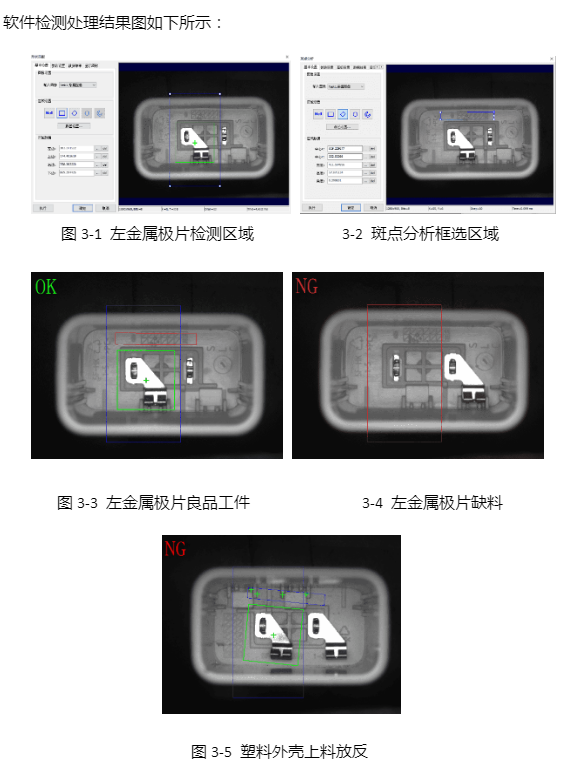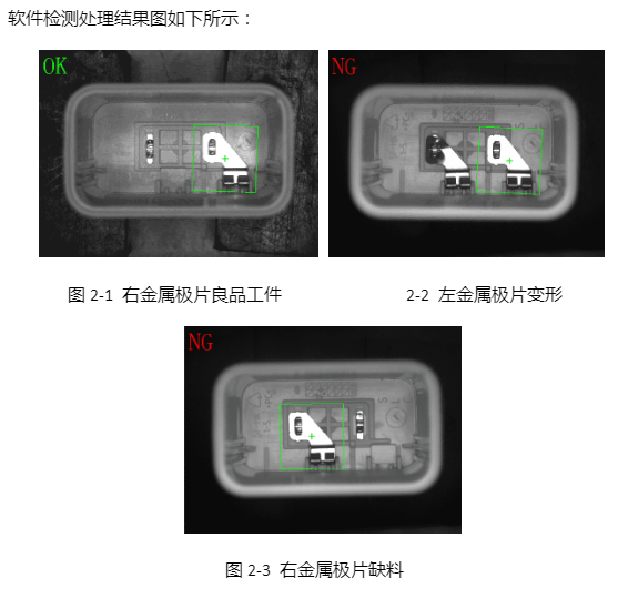 光源选型:金属极片在工件内部,因此选用同轴光从上垂直向下对工件内部金属极片进行照射,可以使金属极片的成像清晰,有利于软件的处理和分析。