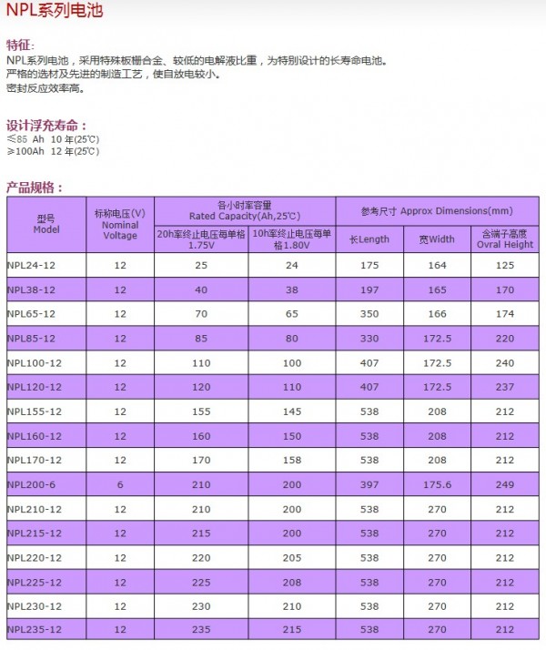 5、寿命长(设计寿命3~6年)经济性好:电池板栅采用耐腐蚀性好的特种铅钙合金,同时采用特殊隔板能保住电解液,再同时用强力压紧正板活性物质,防止脱落,所以是一种寿命长、经济的电池。