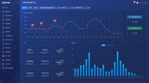 工业能耗管理云平台能够图形化显示工厂用能的实时数据,显示能耗数据的历史曲线(柱状图、折线图、饼状图等),实现远程抄表,对能耗数据实时记录,实时展示设备的运行状态,对其故障信息进行记录。