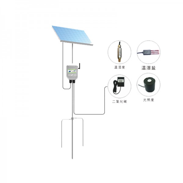 温度、湿度、光照强度、CO₂浓度、土壤温度、土壤水分、土壤盐分 |