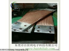 大电流铜编织带叠层软连接压接方式:选择大平方铜编织带(镀锡铜编织带)作为原材料进行叠加达到安装荷载电流要求,按照图纸标注宽度、厚度要求或安装需求采用不同的冲床、液压机配套相应的模具进行压接,压接好的工件按照图纸标注要求进行后续处理