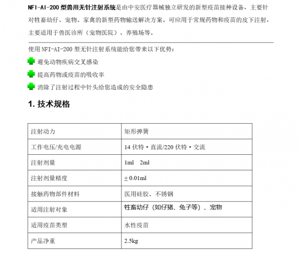 兽用自动连续无针头注射器 猪动物用 宠物无针注射器 中安无针注射机器 无针注射器兽用 动物无针头注射仪批发供应NFI-AI-200型兽用无针注射系统是由中安医疗器械独立研发的新型疫苗接种设备,主要针对牲畜幼仔、宠物、家禽的新型药物输送解决方案。可应用于常规药物和疫苗的皮下注射,主要适用于兽医诊所(宠物医院)、养殖场等。兽用自动连续无针头注射器 猪动物用猪用连续注射器疫苗连续注射器 兽用无针头连续注射器是新开发的无针微创连续注射器。兽用自动连续无针头注射器 猪动物用一次充电可连续注射400次左右。适合猪、羊、牛等规模养殖场动物注射。注射剂量为2ml、1ml 两档,其中1ml 为无针注射,2ml 喷头中内含细微针头,喷射注射时刚刺破动物皮肤表皮,而不触及皮下组织。兽用自动连续无针头注射器 猪动物用