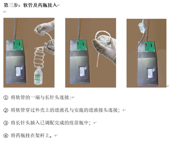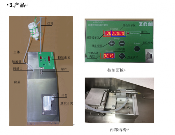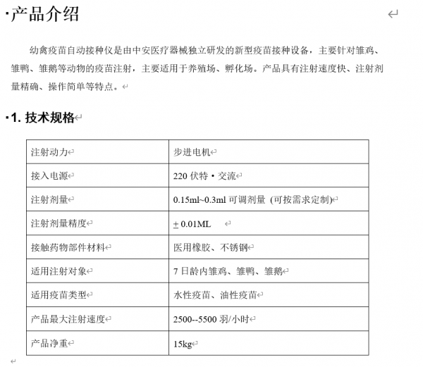 鸭苗鹅苗智能注射器是用于一日龄至七日龄雏禽颈部皮下接种疫苗,维他命或其他产品。鸭苗鹅苗智能注射器有单液和双液两种,单液注射机一次可注射一种液体,双液自动注射机可同时注射两种液体(两种液体在进入禽体前是不混合的)。鸭苗鹅苗智能注射器的注射组件有0.15ml、0.2ml、0.25ml、0.3ml、0.4ml、0.5ml几种规格(客户任选一种或几种规格),也可以根据用户要求定制。注射机上有总计数器(统计清零前接种过的所有雏禽的数量)和预设定计数器(预先设定要接种的每盒或每箱雏禽的数量,接种到预设定的数量后机器会发出报警以提醒操作人员)。使用该机器,熟练技术人员每小时可接种3000~6000羽。
