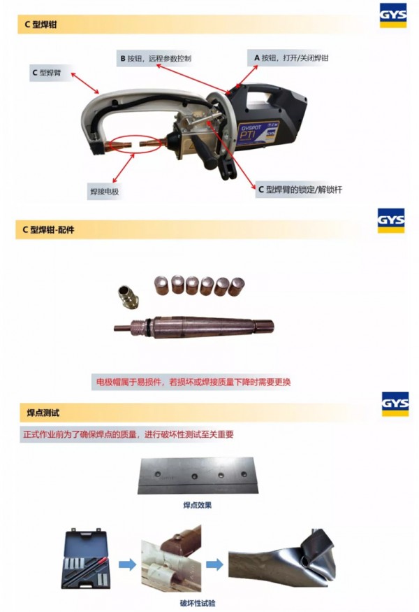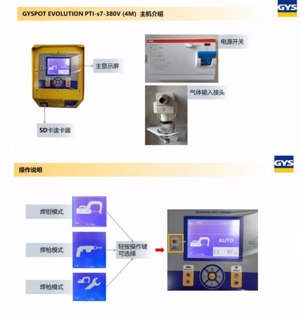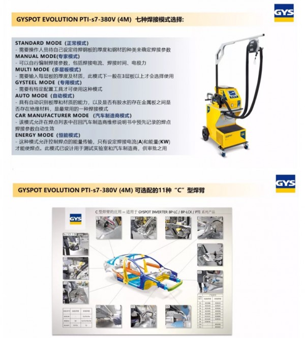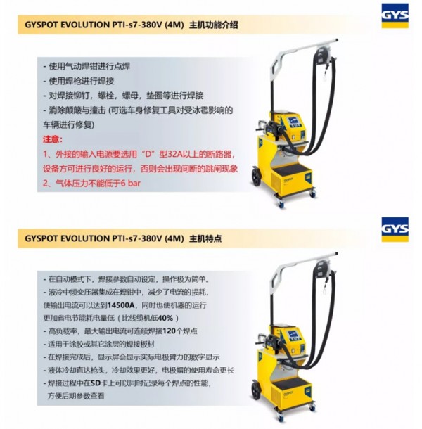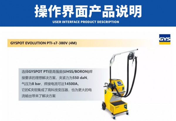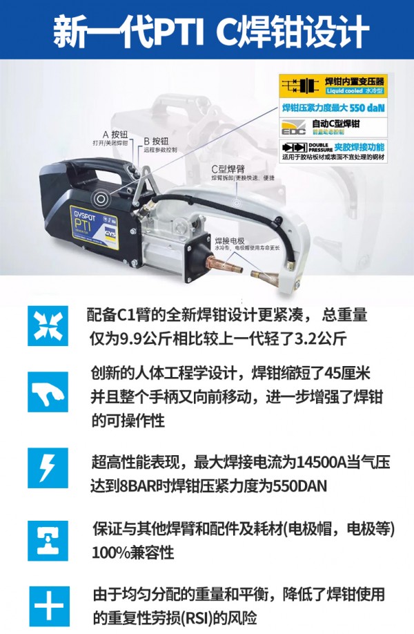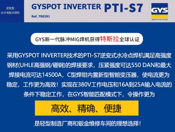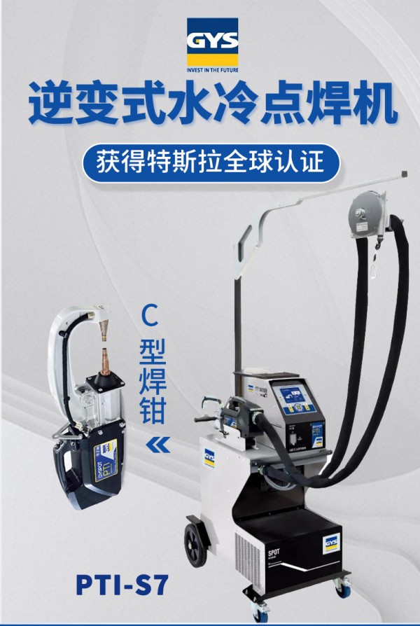 逆变型水冷电阻点焊机采用GYSPOT INVERTER技术的PTI-S7逆变式水冷点焊机满足高强度钢材的焊接要求,压紧强度可达550 DAN和最大焊接电流可达14500A,C型焊钳内置新型智能变压器,使电流更为稳定,工作更为高效!实现在380V工作电压和16A到25A输入电流的条件下稳定工作,在GYS智能匹配模式下,令操作更为高效、精确、便捷是轻