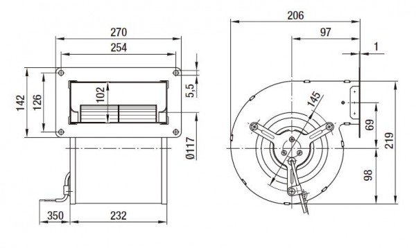 ebmpapst 离心式鼓风机,离心式双入口、高性能风扇电动机鼓风机的气流为 910m³ μ a/h 、额定电源电压为 230Vac 。它集成在叶轮内、可减少安装尺寸。长 180mm 、宽 216mm 、深 199mm 。