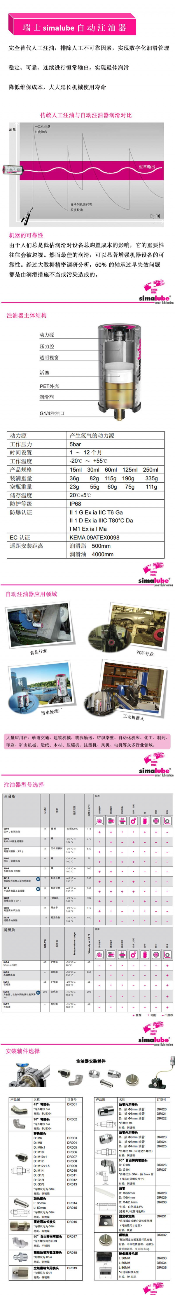 瑞士simalube自动注油器SL02系列,瑞士simalube自动注油器是一款单点式自动注油器,凭借独特的性能:全自动、均匀准时、准确、安全可靠、恒常输出、数字化润滑管理,设备得到最佳润滑,大大延长使用寿命。现在被广泛应用在各行各业:汽车工业、机器人工业、电子屏幕生产工业、纺织染整行业、矿山机械、包装印刷等。