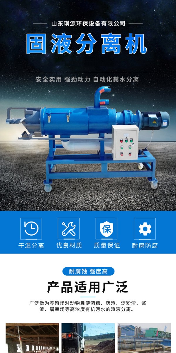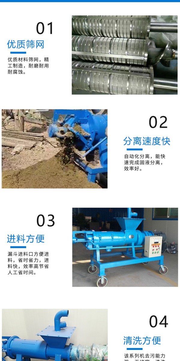 牛粪固液分离机可广泛做为鸡、牛、猪及各类集约化养殖场对动物粪便、酒糟、药渣、淀粉渣、酱渣、屠宰厂等高浓度有机污水的渣液分离。