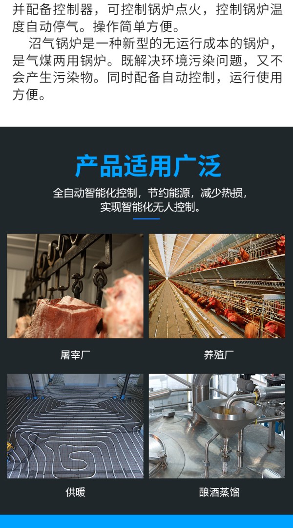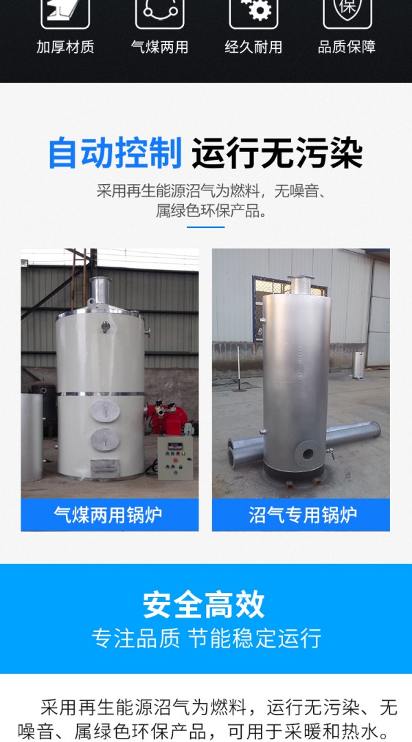 沼气锅炉具有体积小、安装方便、操作简便,适用于中小城市的机关、学校、医院、宾馆等单位的采暖、饮水、洗浴等生活设施。沼气锅炉也可用于广大农村的水产养殖、农业生产等部门。该锅炉配备控制器,控制锅炉点火,控制温度,自动停气,配有熄火保护,缺水保护,高温保护,提供全面的安全保护,操作简单方便,安装占地面积小。