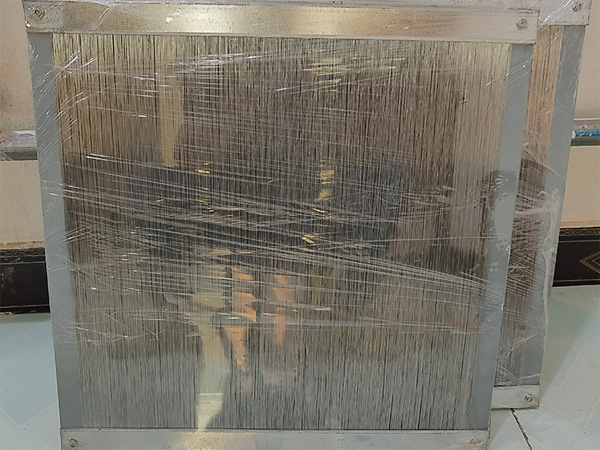 纤维发生振动,强化水雾粒与气体中粉尘的碰撞,提高粉尘的捕获率,同时也提高了振弦过滤板纤维的自净能力。含尘气体经过振弦过滤板后