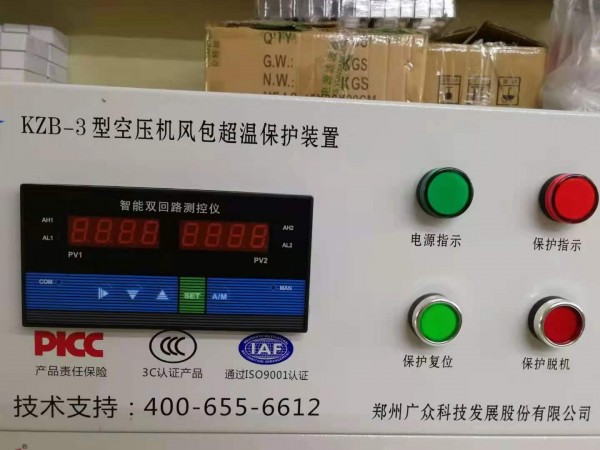 KZB-3型空压机风包超温保护装置通过温度传感器对风包温度信号实施采集,由高精度测控微处理器接收风包温度信号,经过程序的数据处理和数据比较,当达到设定的报警温度或保护温度时,分别驱动报警输出和保护输出,切断空压机急停回路,同时声、光报警。实现对空压机风包的超温保护。