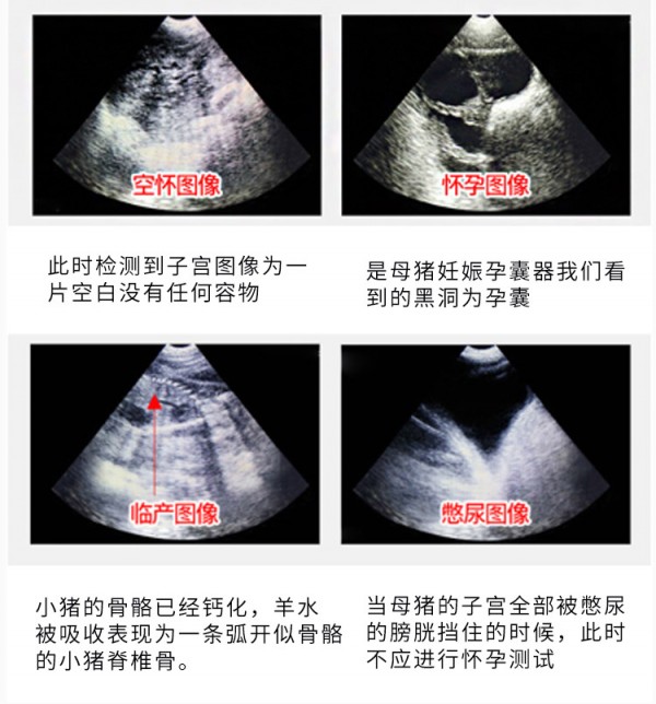 兽用B超超声图像的判断:根据经验,母驴在妊娠20天以前,胚囊在宫腔内有一定的游走性,20天后位置逐渐固定下来。据初步统计,排卵与胚胎附植发生于同侧的占66. 7 %,发生于异侧的占33. 3%。所以在进行兽用B超对驴进行妊娠诊断时,一般要在配种21-23后进行,这样检出率会很高。超声妊娠诊断法检查结果:母驴未孕子宫角呈圆形,与周围组织界限明显;妊娠子宫角呈圆形,轮廓清晰,中间为胚囊,呈液性暗区(无回声区)当探查到胚体时,可见胚囊内有形状不规则的强回声团块,有时可见到它的活动。