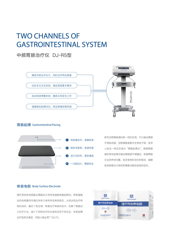胃肠动力治疗仪基于起搏点的电节律活动被外加的不同频率电流“驱动”,利用先进的电子技术模拟正常的胃肠生物电信号,选择适宜的起搏参数,通过体表贴敷电极,作用于胃肠起搏点,并使它产生“ 跟随谐振”效应,从而纠正异常的胃肠电节律或抑制异位起搏,点的电活动,促使胃肠产生足够有效的节律性收缩及推进运动,缓解或消除胃肠功能紊乱的症状,从而达到治疗目的。