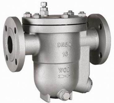 内部有一个精细研磨的不锈钢空心浮球,既是浮子又是启闭件,无易损零件,使用寿命很长。装置刚起动时,管道内出现空气和低温冷凝水,双金属自动排空气元件把浮球推离阀座,阀门打开,排除不凝结气体,低温冷凝水流进疏水阀,浮球上升,凝结水迅速排放。装置很快提升温度,管道内温度上升到饱和温度之前,双金属自动排空气元件感温变型伸直;蒸汽疏水阀进入正常运行状况,浮球随液位升降调节阀孔流量;当凝结水停止进入时,浮球随介质流向逼近阀座,关闭阀门。立式自由浮球式蒸汽疏水阀的阀座总处于液位以下,形成水封,无蒸汽泄漏。