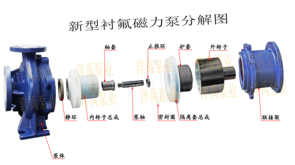CQB65-50-125FT氟塑料磁力泵(衬F46磁力泵)工作原理:防漏设计:取消了轴封、利用磁力耦合间接驱动,完全消除了滴漏的烦恼,绝不污染使用场地。由于泵的过流部分选用“氟塑料(F26、F46)”制造。可连续输送任意浓度的酸,碱,强氧化剂等腐蚀介质毫不受损。