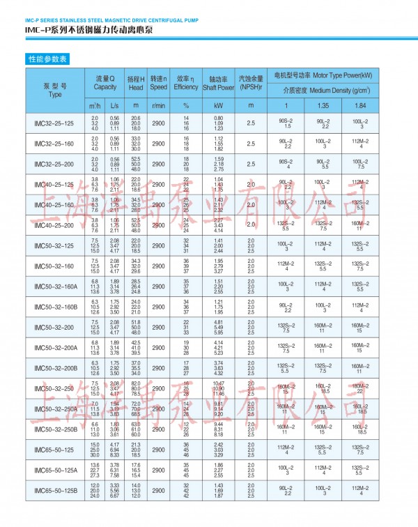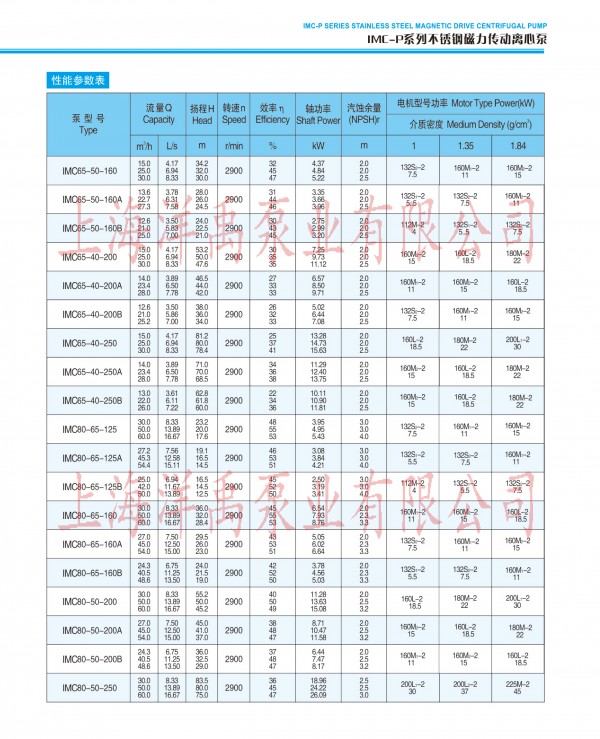 IMC-B型耐高温磁力驱动泵系列性能参数范围: