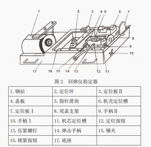 回弹仪检定器的结构图 1 和主要零部件名称如图 2 所示。
