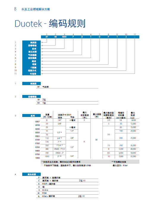 Duotek系列气动隔膜泵提供多种泵头尺寸、材质和密封供用户选择。从