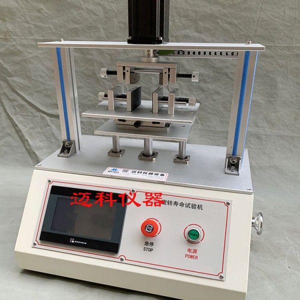 保温杯盖旋转寿命试验机用于保温杯盖疲劳测试。保温杯盖旋转寿命试验机采用触摸屏可设置旋转角度、速度、次数以及停留时间,真实模拟杯盖在使用中的寿命测试。