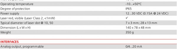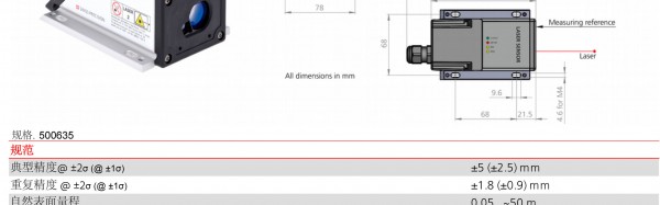 产品特点:● 测量范围0 ~ 50 m● 最高测量频率10赫兹● 测量精度5毫米● 串行接口输出● 模拟量输出精度(0.1%)● 两个数字量输出● 一个错误信号输出● 一个数字信号输入● 防护等级IP65● 工作温度-10...+50℃