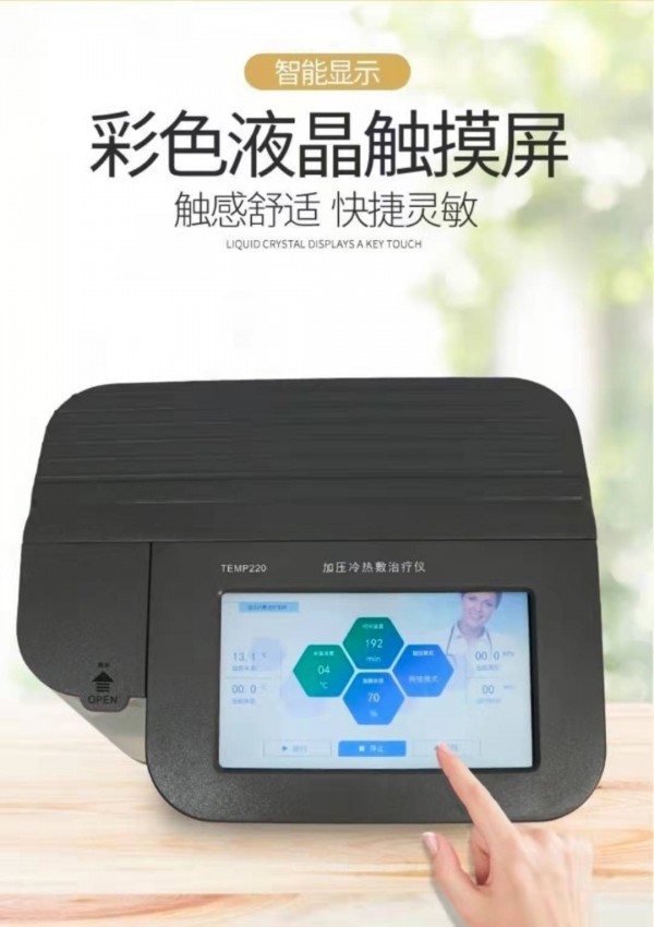 煜博半导体加压冷疗设备告别传统按键设计,采用10 "彩色液晶触摸屏,方便快捷,减轻了医护人员的工作难度。