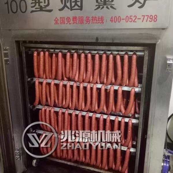 商用红肠烟熏炉,红肠熏蒸一体炉使其外观产生的烟熏色,对加硝肉制品有发射的作用