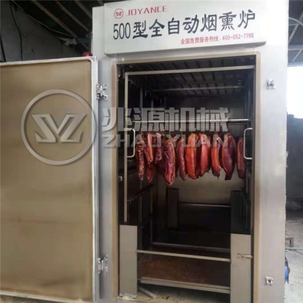 四川腊肉烟熏炉具有烘烤、干燥、蒸煮、冷熏、热熏、冷却等功能,用户可根据产品加工工艺的不同要求,灵活选择。适当的工艺程序,实现自动控制,达到熟化和灭菌之目的。本设备由烟熏箱、自动程序控制器、烟雾发生器、烟熏车四部分组成。关键部件是由蒸汽管道、热交换器和出气通道组成完善的循环系统,箱内熏烟与热气的混合气体在两组循环风机的作用下,形成涡流区域,使混合气体以适宜的速度平衡而均匀地通过悬挂在烟熏箱内的肉制品,使其熟化和灭菌。