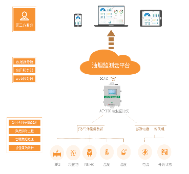 对油烟排污数据的监测,包括油烟排放浓度,颗粒物,NmHc等数值采集监测;同时对监控风机和净化器的启停状态、运行数据进行监测